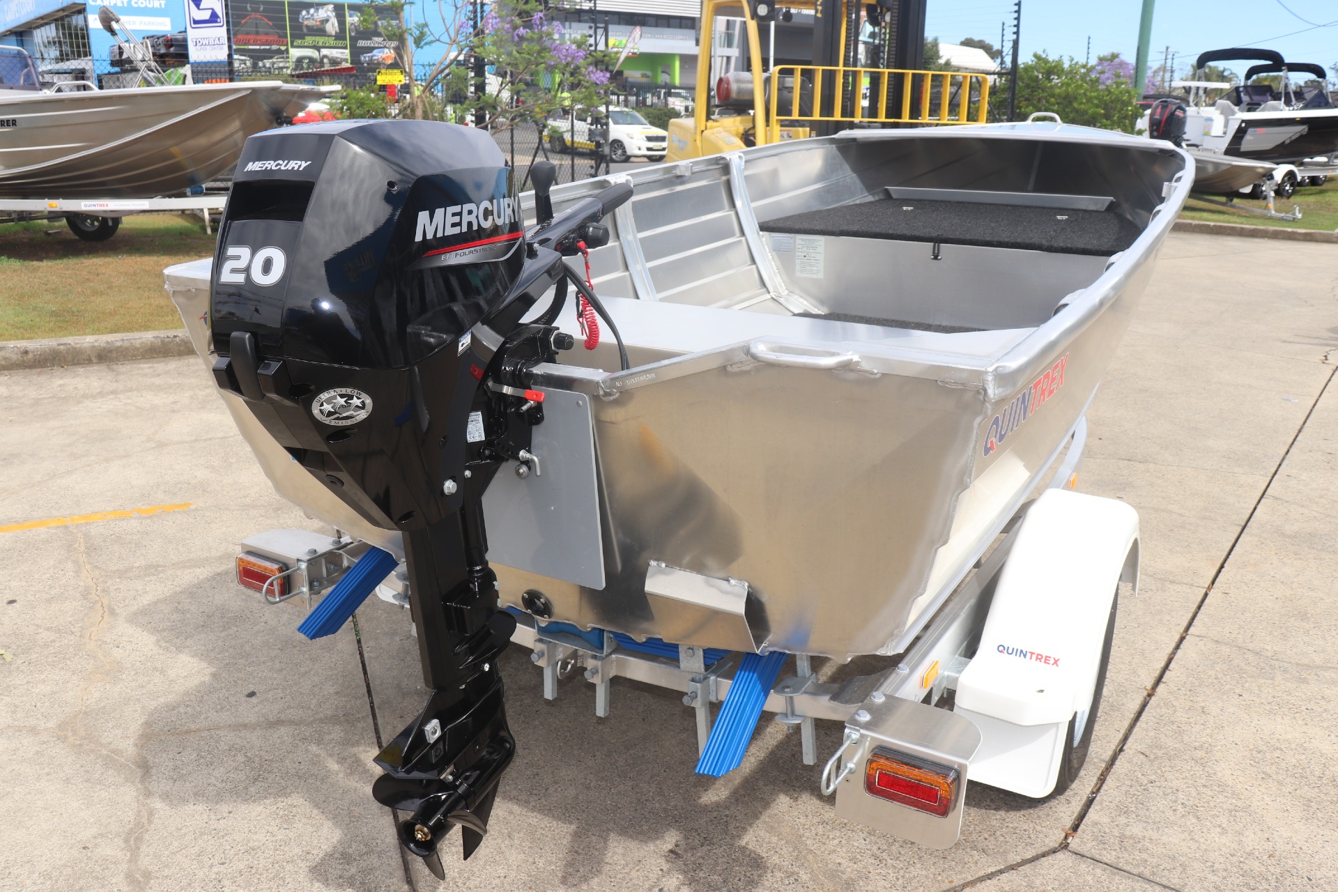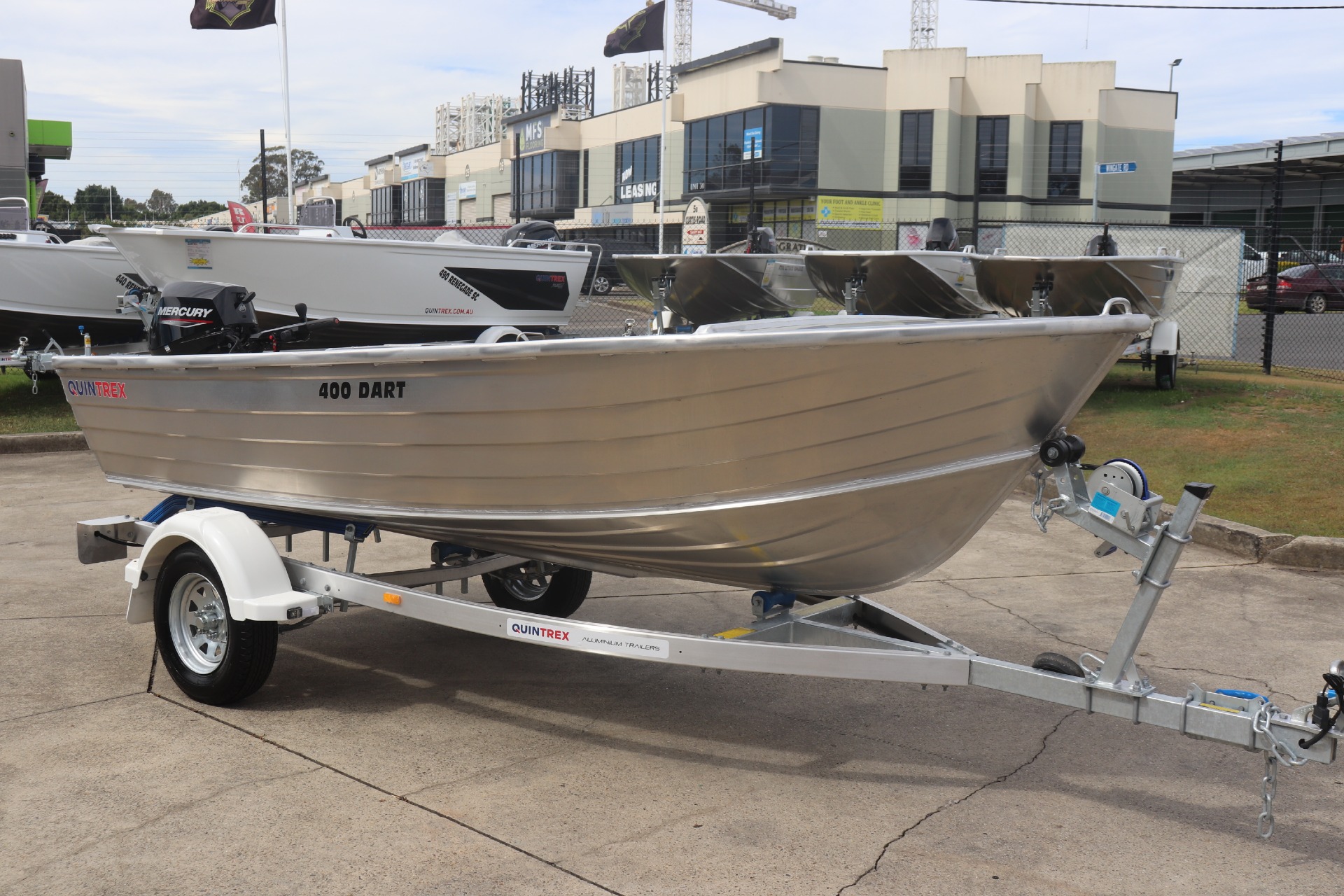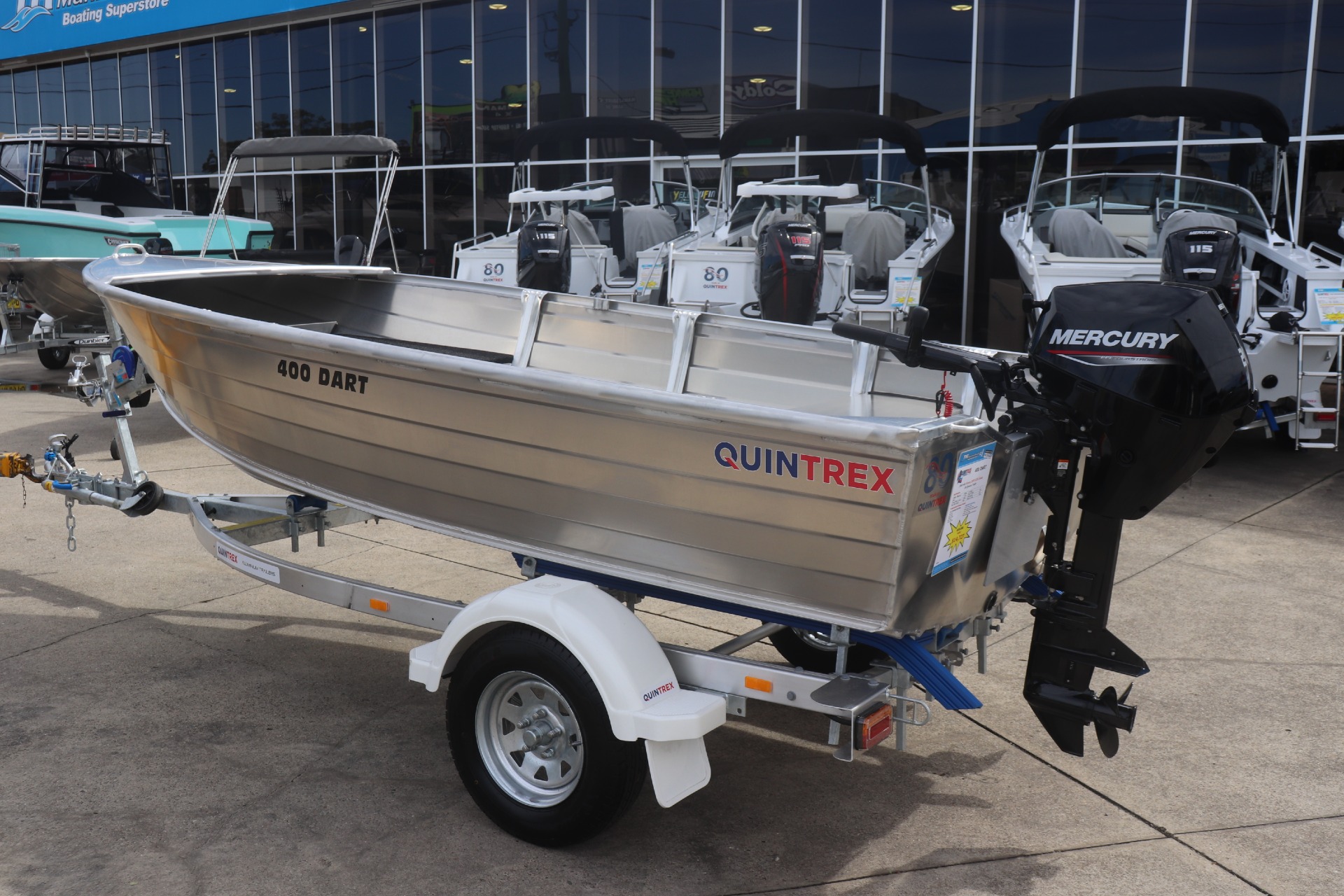 QUINTREX 400 DART POWERED BY A MERCURY 20ELH 4 STROKE ON A QUINTREX ALLOY TRAILER CHRISTMAS TINNIE SALE...IF PURCHASED BEFORE 15.01.26, RECIEVE A FREE GENUINE QTX BOAT STORAGE COVER PLEASE READ... TR MarineWorld is a Highly Reputable NSW Quintrex Specialist dealership. All our Quintrex Boats are CORRECTLY advertised showing Standard specifications and detailing the factory fitted options that have been installed to assure you are buying the right Boat. The photos we display in our ads are of the exact boat for sale, powered by the best suggested Horsepower engine assuring you are buying the Perfect boat from a reputable Dealership at a fair price. ALL STANDARD FEATURES: Carpet: Floor Low Carpet: Fuel Tank Rack Casting Platform Anchor Gusset Front Deck Gunnel Lip Handle Bow Handles Transom Solid Corners Transducer Bracket Seats: Bench Options ADDITIONAL FACTORY FEATURES INCLUDE: Flipper Guide Kit TR MARINE ADDITIONAL FEATURES INCLUDE: 12 Months NSW Boat & Trailer Registrations Paddle, Bucket, Horn & Torch Anchor, Rope & Chain Rear Tie Down Straps Fire Extinguisher 4 x PFD1 Life Jackets Earmuffs (Engine Flusher) *We have a well-stocked undercover Showroom and are open 6 days a week. *Need Finance? We're here to help get you on the water sooner with Mercury Marine Finance *Give us a call today to speak with one of our friendly team members 6 Year Mercury Factory Engine Warranty*