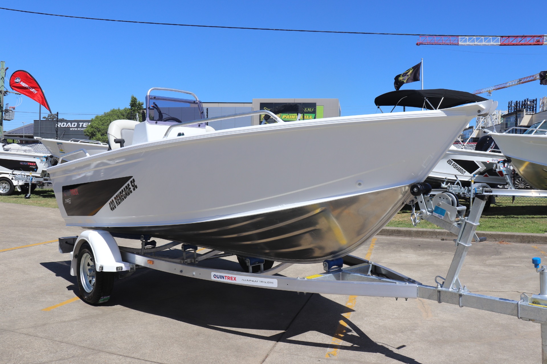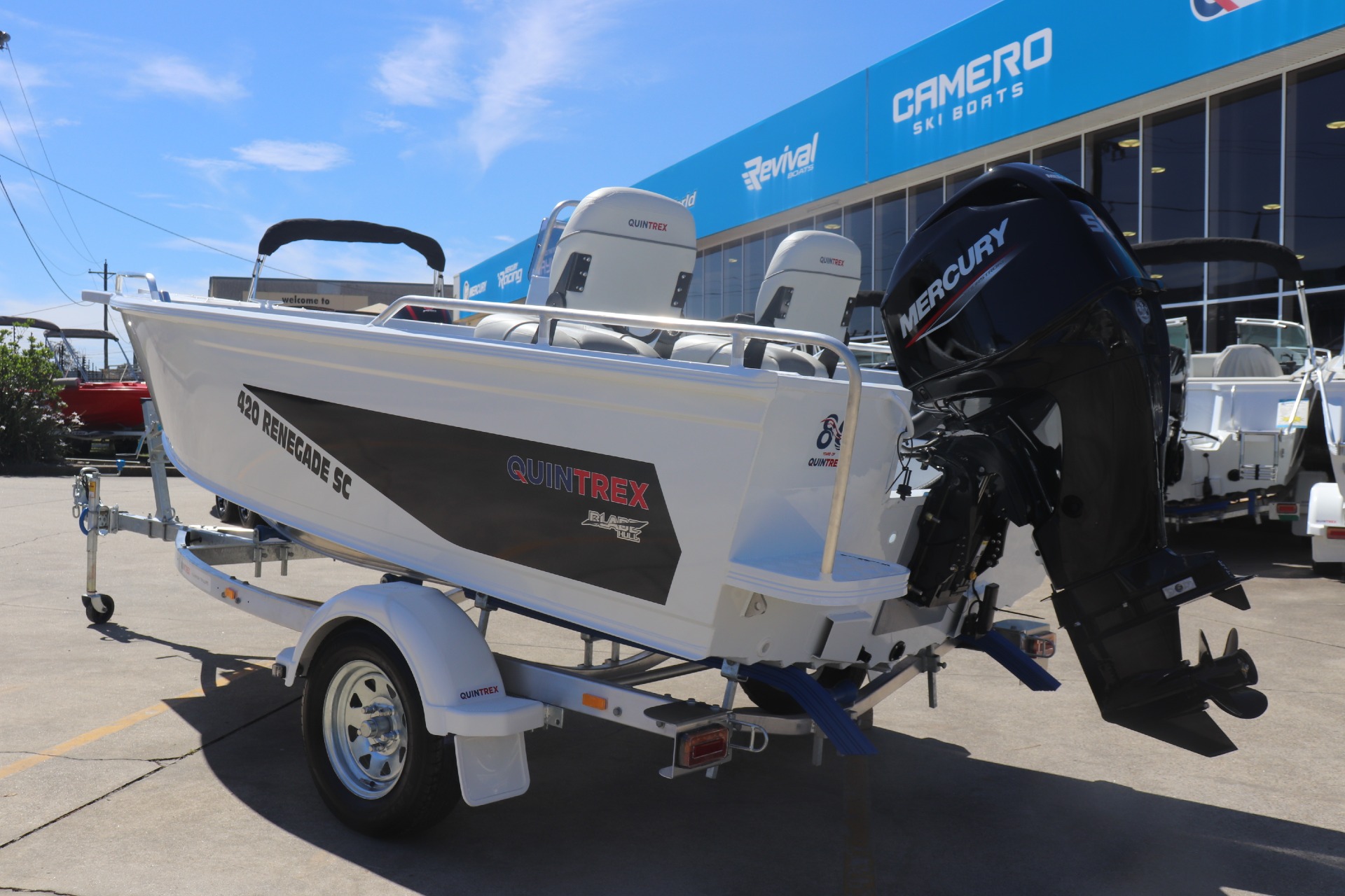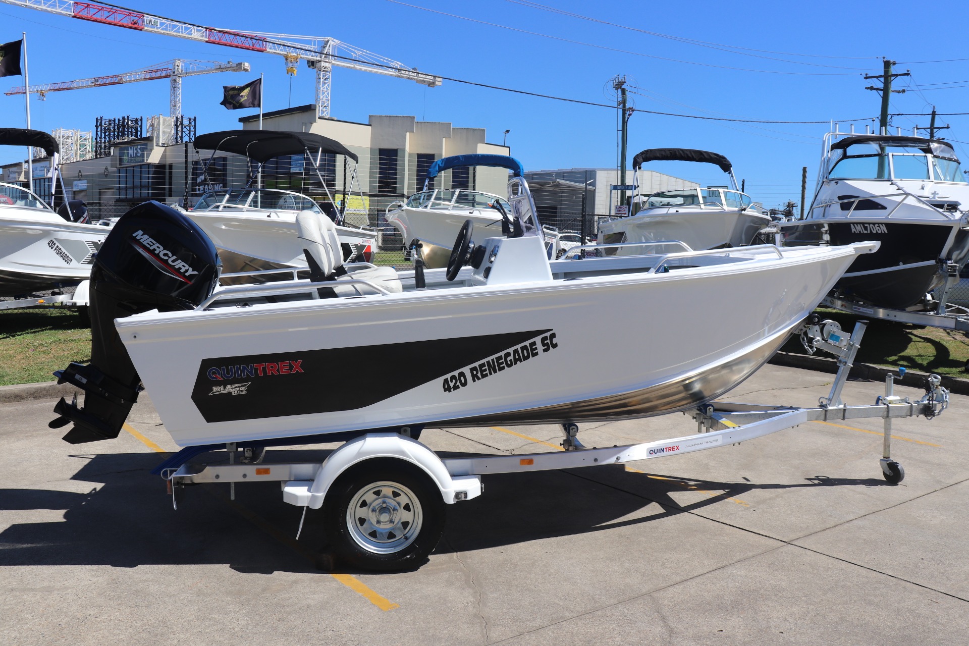 QUINTREX 420 RENEGADE SC POWERED BY A MERCURY 50HP 4 STROKE ON A QUINTREX ALLOY TRAILER PLEASE READ... is a Highly Reputable NSW Quintrex Specialist dealership. All our Quintrex Boats are CORRECTLY advertised showing Standard specifications and detailing the factory fitted options that have been installed to assure you are buying the right Boat. The photos we display in our ads are of the exact boat for sale, powered by the best suggested Horsepower engine assuring you are buying the Perfect boat from a reputable Dealership at a fair price. FEATURES INCLUDE: ALL STANDARD FEATURES: Casting Platform Helm: Side Console & Mechanical Steering Anchorwell Battery Box Bow Roller Drink Holder Cups Rod Holders (4) Transom Step & Rail Alloy Cleat on Front Deck Blade Hull Centre Console Deck Rear Casting Platform & LBT Side Decks Extruded Side Pockets Smooth Topsides Transducer Brackets x 2 Side Rails Seat Positions (3) Seats: Pedestal GT54UHD - Transom Mount Transducer ADDITIONAL FACTORY FEATURES INCLUDE: Garmin Striker VIVID 7SV Mercury SC1000 Digital Tacho Painted Hull - White QTX 80th Anniversary Pack Extra Seat Spiggot in Casting Platform Thruster Bow Mount Plate Upgraded Steering Wheel USB Port Welded Top Deck & Gunnels TR MARINE ADDITIONAL FEATURES INCLUDE: 12 Months NSW Boat & Trailer Registrations Paddle, Bucket, Horn & Torch Rear Tie Down Straps Fire Extinguisher Anchor, Rope & Chain 4 x PFD1 Life Jackets Earmuffs (Engine Flusher) *We have a well-stocked undercover Showroom and are open 6 days a week. *Need Finance? We're here to help get you on the water sooner with Mercury Marine Finance *Give us a call today to speak with one of our friendly team members 6 Year Mercury Factory Engine Warranty*