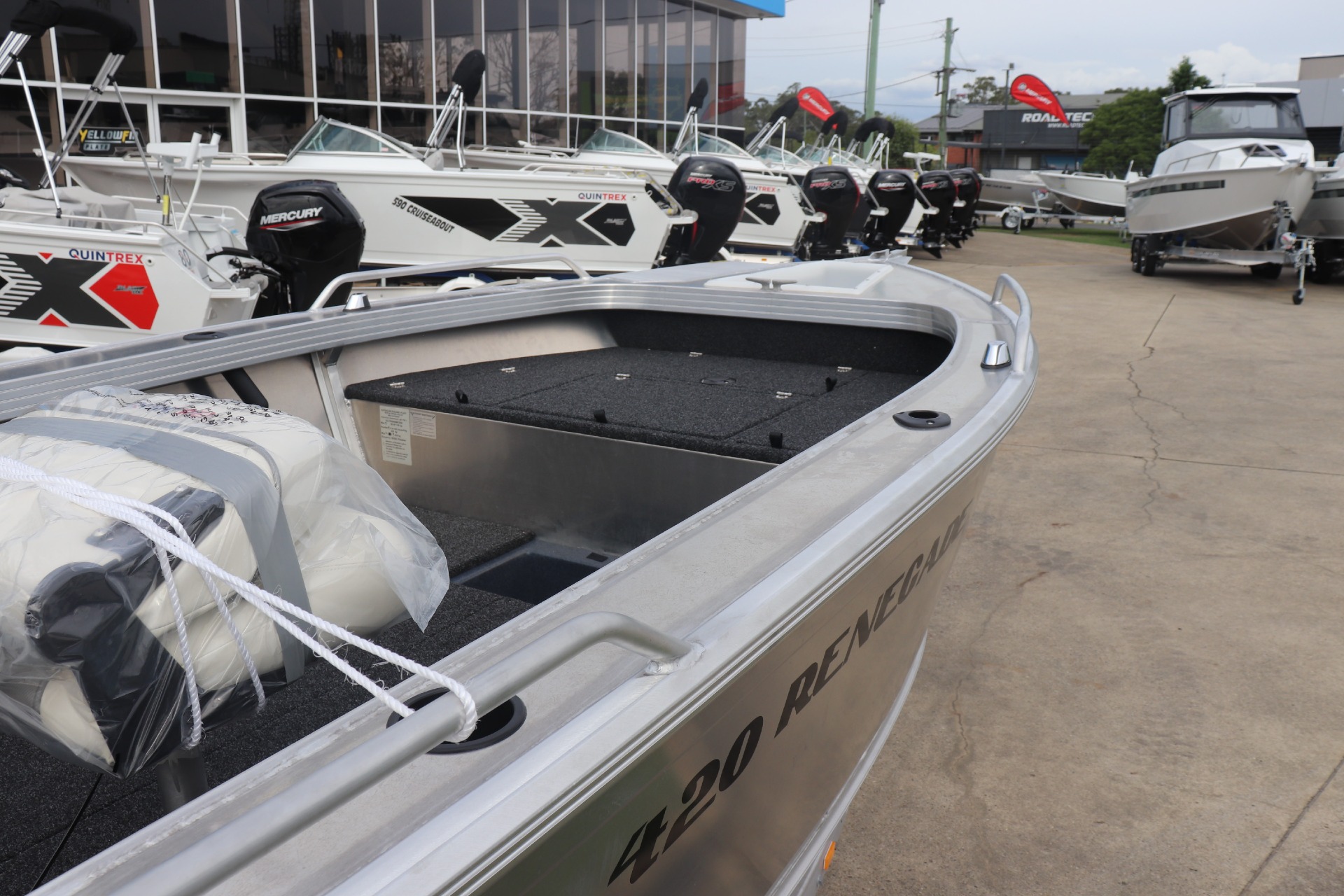 QUINTREX 420 RENEGADE TS POWERED BY A MERCURY 50ELHPT 4 STROKE ON A QUINTREX ALLOY TRAILER ***READY FOR RIMMEDIATE DELIVERY*** ***ENQUIRE NOW*** ***MERCURY GET MORE PROMOTION INCLUDED IN PRICE*** PLEASE READ... TR MARINE is a Highly Reputable NSW Quintrex Specialist dealership. All our Quintrex Boats are CORRECTLY advertised showing Standard specifications and detailing the factory fitted options that have been installed to assure you are buying the right Boat. The photos we display in our ads are of the exact boat for sale, powered by the best suggested Horsepower engine assuring you are buying the Perfect boat from a reputable Dealership at a fair price. FEATURES INCLUDE: ALL STANDARD FEATURES: Casting Platform Anchorwell Battery Box Bow Roller Drink Holder Cups Rod Holders (4) Transom Step & Rail Alloy Cleat on Front Deck Blade Hull Centre Console Deck Rear Casting Platform & LBT Side Decks Extruded Side Pockets Smooth Topsides Transducer Brackets x 2 Side Rails Seat Positions (4) Seats: Pedestal GT54UHD - Transom Mount Transducer ADDITIONAL FACTORY FEATURES INCLUDE: Flipper Guide Kit Seat Spiggot in Casting Platform Thruster Bow Mount Plate Welded Top Deck & Gunnels TR MARINE ADDITONAL OPTIONS INCLUDE: 12 Months NSW Boat & Trailer Registrations Paddle, Bucket, Horn & Torch Rear Tie Down Straps Fire Extinguisher Anchor, Rope & Chain Earmuffs (Engine Flusher) 4 x PFD1 Life Jackets *We have a well-stocked undercover Showroom and are open 6 days a week. *Need Finance? We're here to help get you on the water sooner with Mercury Marine Finance *Give us a call today to speak with one of our friendly team members 6 Year Mercury Factory Engine Warranty*