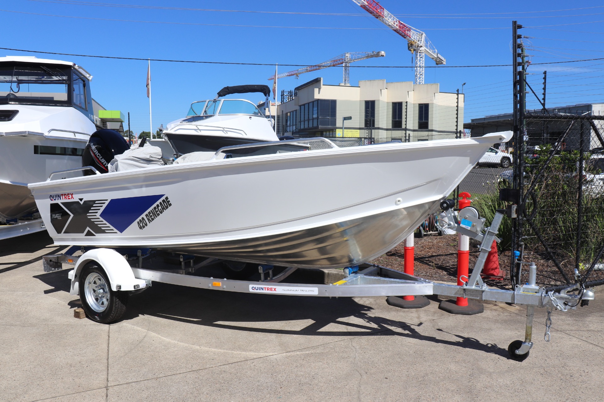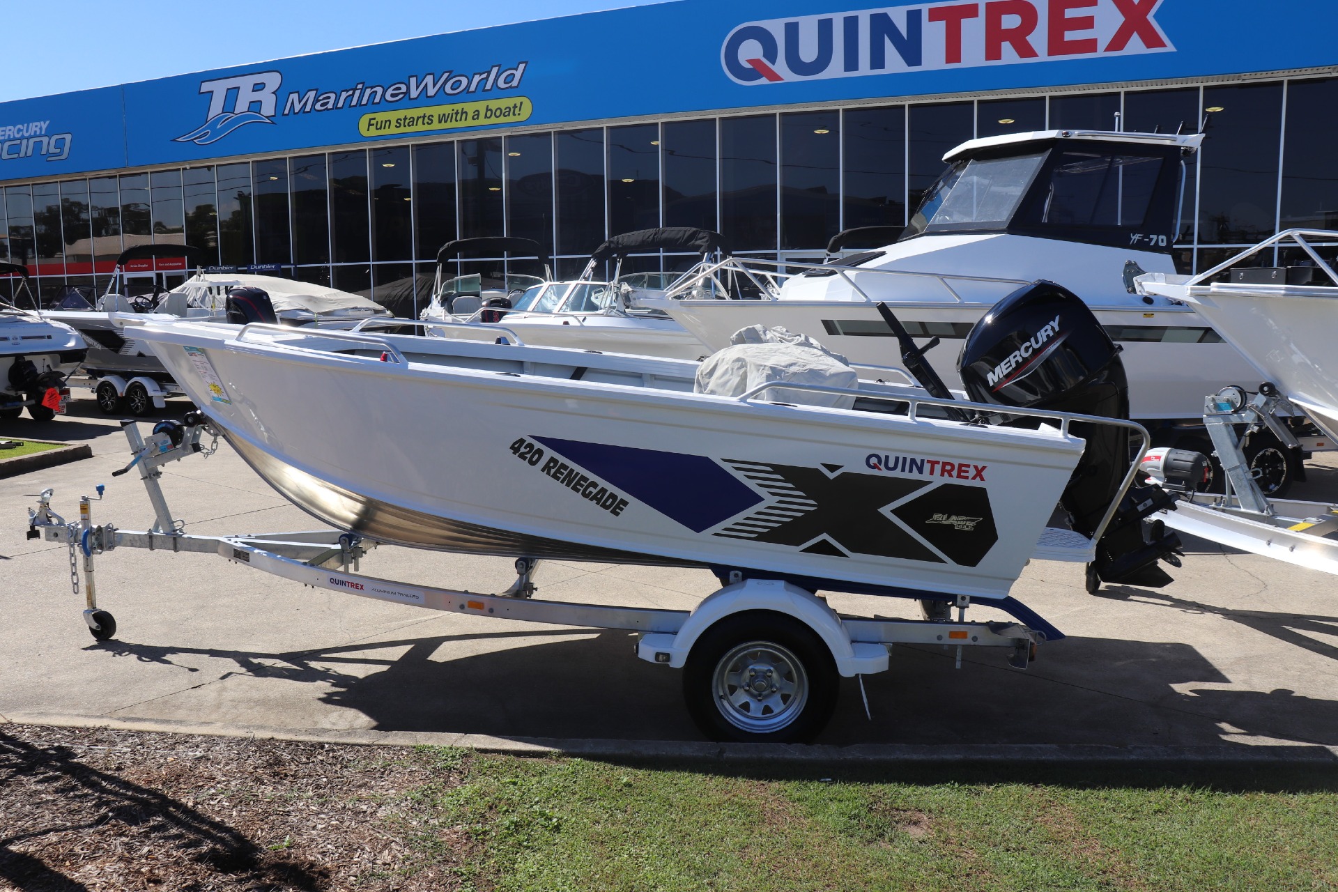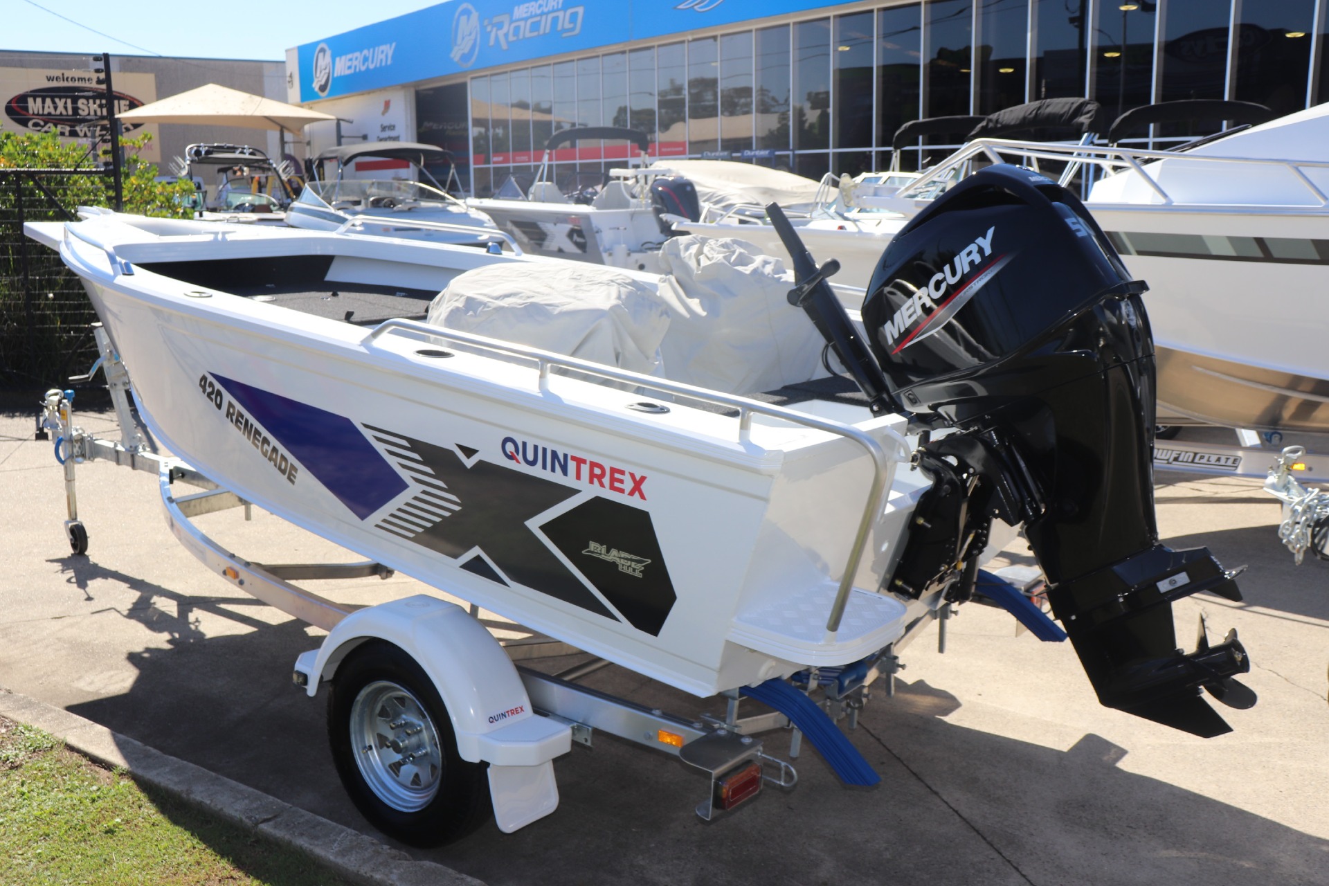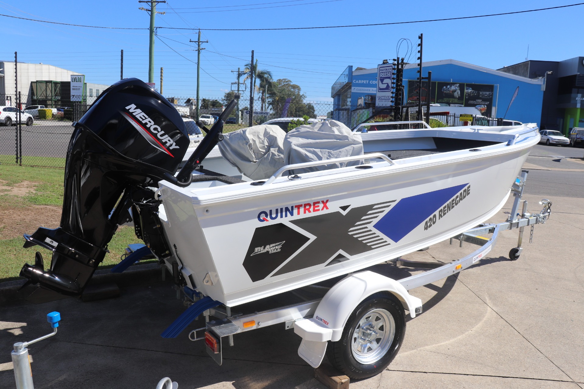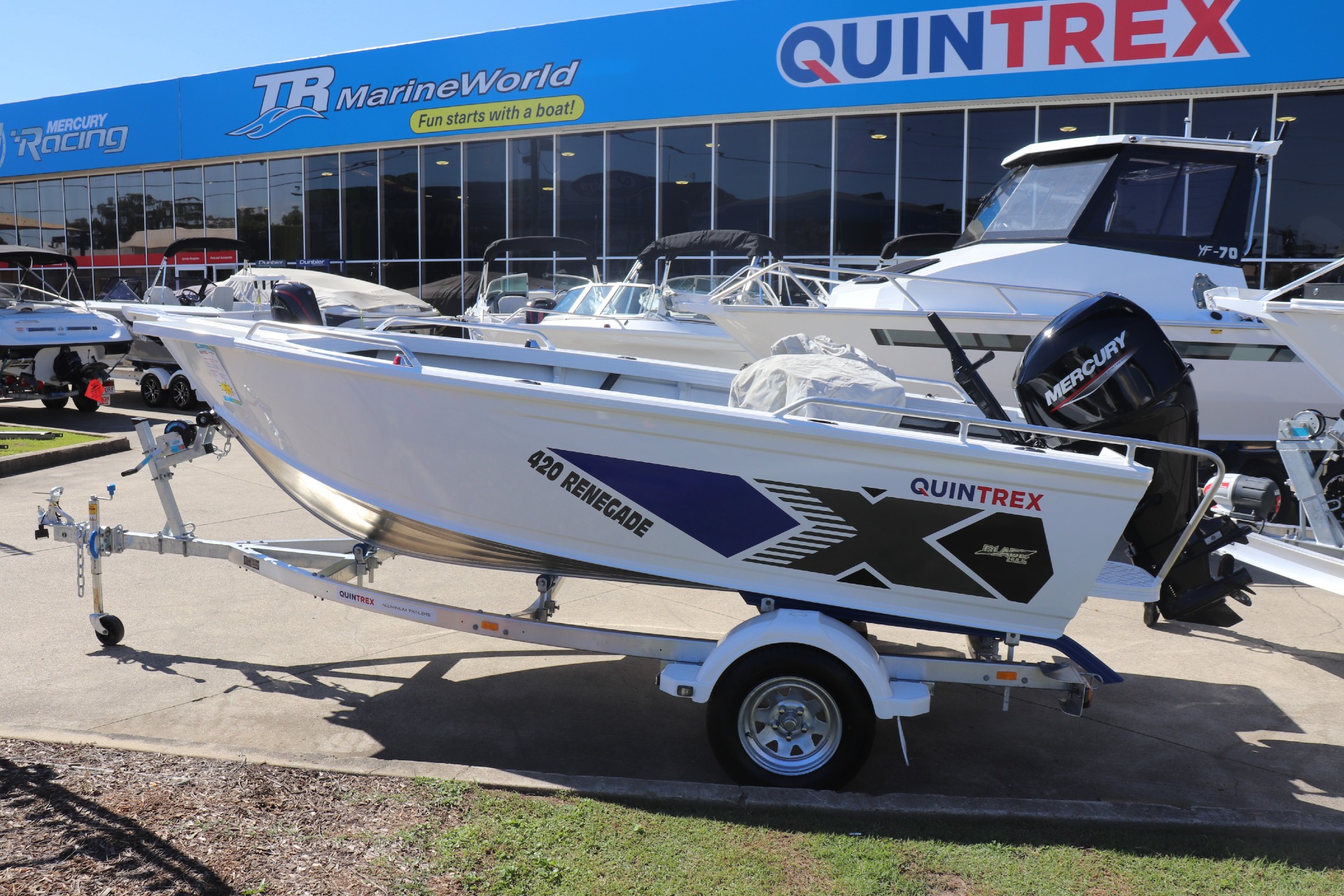 QUINTREX 420 RENEGADE TS POWERED BY A MERCURY 50ELHPT 4 STROKE ON A QUINTREX ALLOY TRAILER Mercury get more promotion included in price ! PLEASE READ... TR MARINE is a Highly Reputable NSW Quintrex Specialist dealership. All our Quintrex Boats are CORRECTLY advertised showing Standard specifications and detailing the factory fitted options that have been installed to assure you are buying the right Boat. The photos we display in our ads are of the exact boat for sale, powered by the best suggested Horsepower engine assuring you are buying the Perfect boat from a reputable Dealership at a fair price. FEATURES INCLUDE: ALL STANDARD FEATURES: Casting Platform Anchorwell Battery Box Bow Roller Drink Holder Cups Rod Holders (4) Transom Step & Rail Alloy Cleat on Front Deck Blade Hull Centre Console Deck Rear Casting Platform & LBT Side Decks Extruded Side Pockets Smooth Topsides Transducer Brackets x 2 Side Rails Seat Positions (4) Seats: Pedestal GT54UHD - Transom Mount Transducer ADDITIONAL FACTORY FEATURES INCLUDE: Flipper Guide Kit Painted Hull - White Seat Spiggot in Casting Platform Thruster Bow Mount Plate Welded Top Deck & Gunnels TR MARINE ADDITONAL OPTIONS INCLUDE: 12 Months NSW Boat & Trailer Registrations Paddle, Bucket, Horn & Torch Rear Tie Down Straps Fire Extinguisher Anchor, Rope & Chain Earmuffs (Engine Flusher) 4 x PFD1 Life Jackets *We have a well-stocked undercover Showroom and are open 6 days a week. *Need Finance? We're here to help get you on the water sooner with Mercury Marine Finance *Give us a call today to speak with one of our friendly team members 6 Year Mercury Factory Engine Warranty*