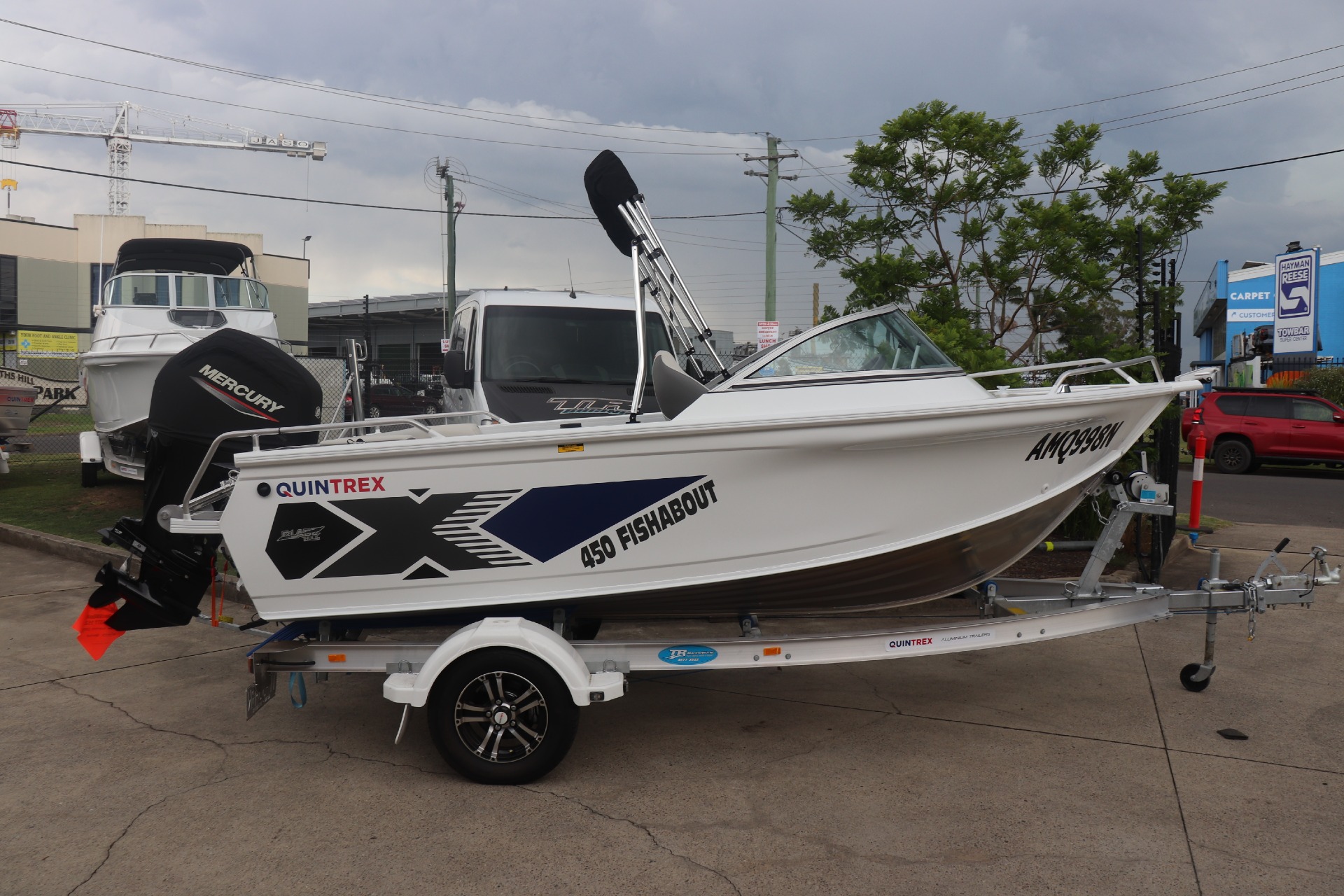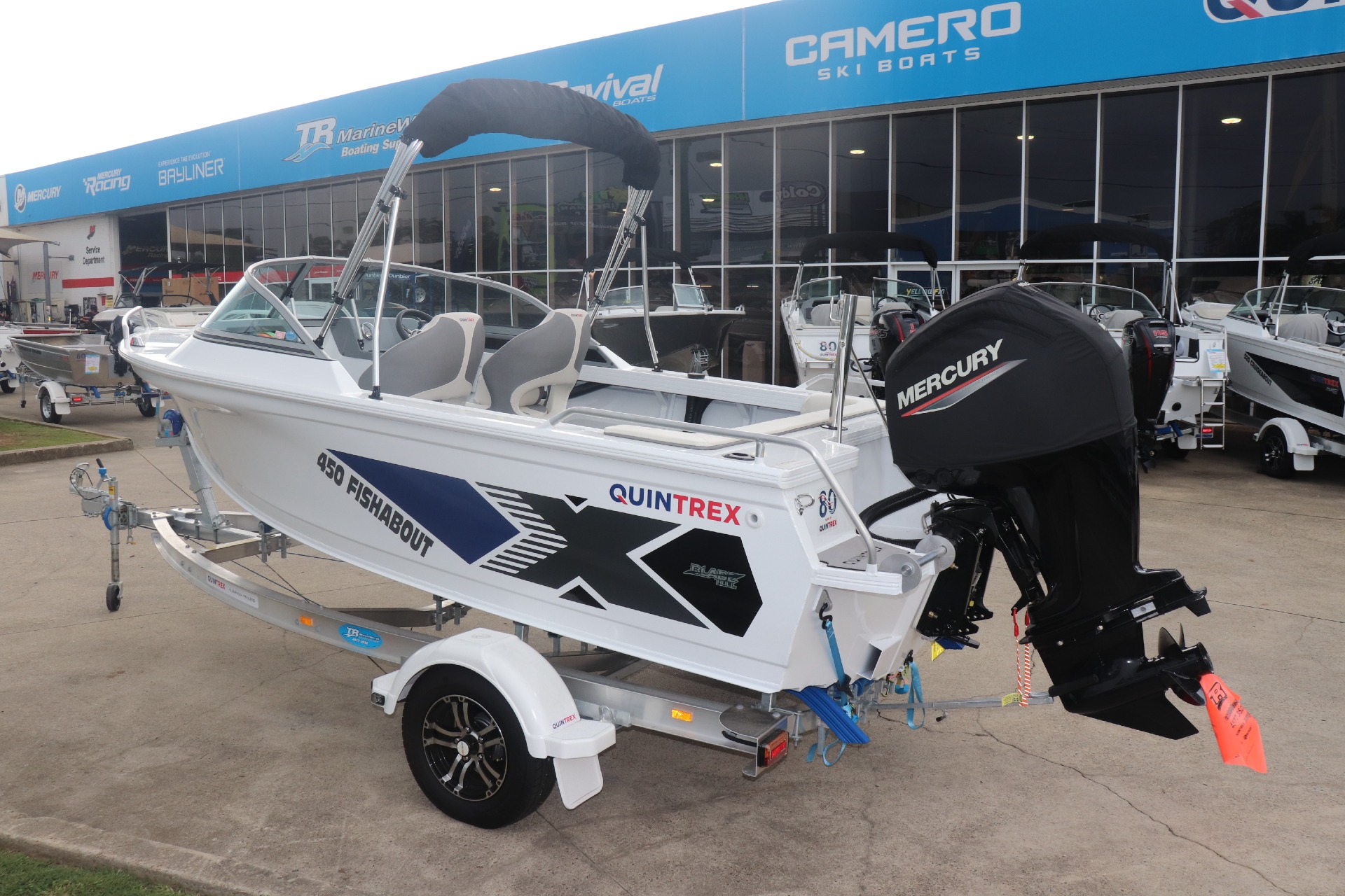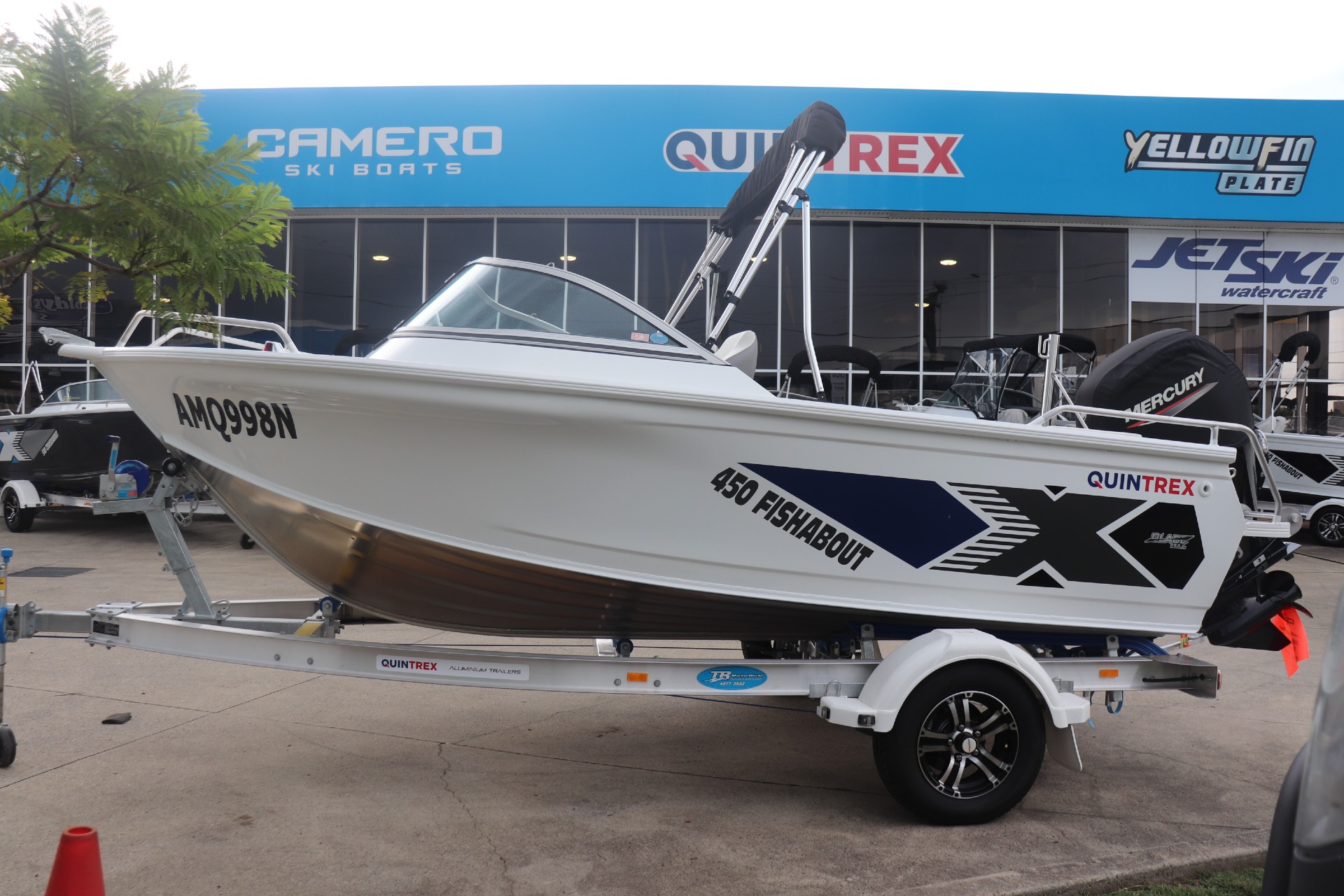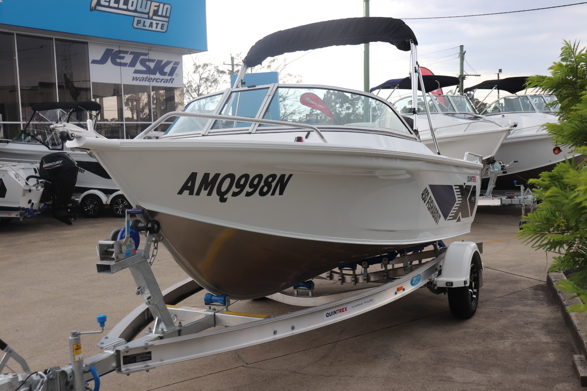 USED 2026 450 FISHABOUT POWERED BY A MERCURY 75HP 4 STROKE ON A QUINTREX ALLOY TRAILER FRESHLY SERVICED ***7.4 ENGINE HOURS*** FEATURES INCLUDE: ALL STANDARD FEATURES+ Comfort Pack - Bimini & Envelope - Deluxe rear Lounge & Backrest - Upgraded Maritime Sports Seats Cargo/Luggage Netting Garmin 5" Sounder Upgraded Steering Wheel Ski Hooks S.S Ski Pole QTX Boat Storage Cover *We have a well-stocked undercover Showroom and are open 6 days a week. *Need Finance? We're here to help get you on the water sooner with Mercury Marine Finance *Give us a call today to speak with one of our friendly team members
